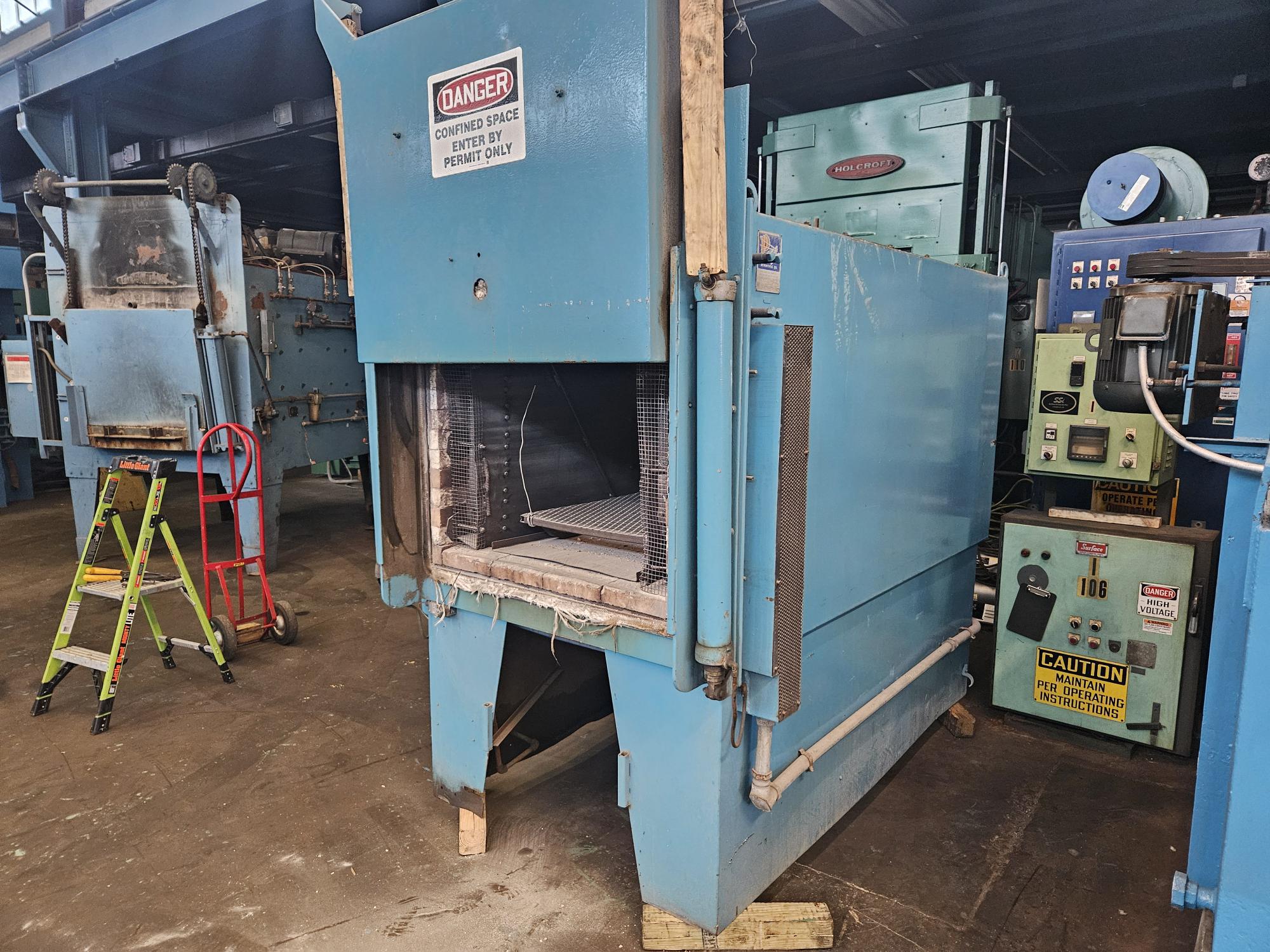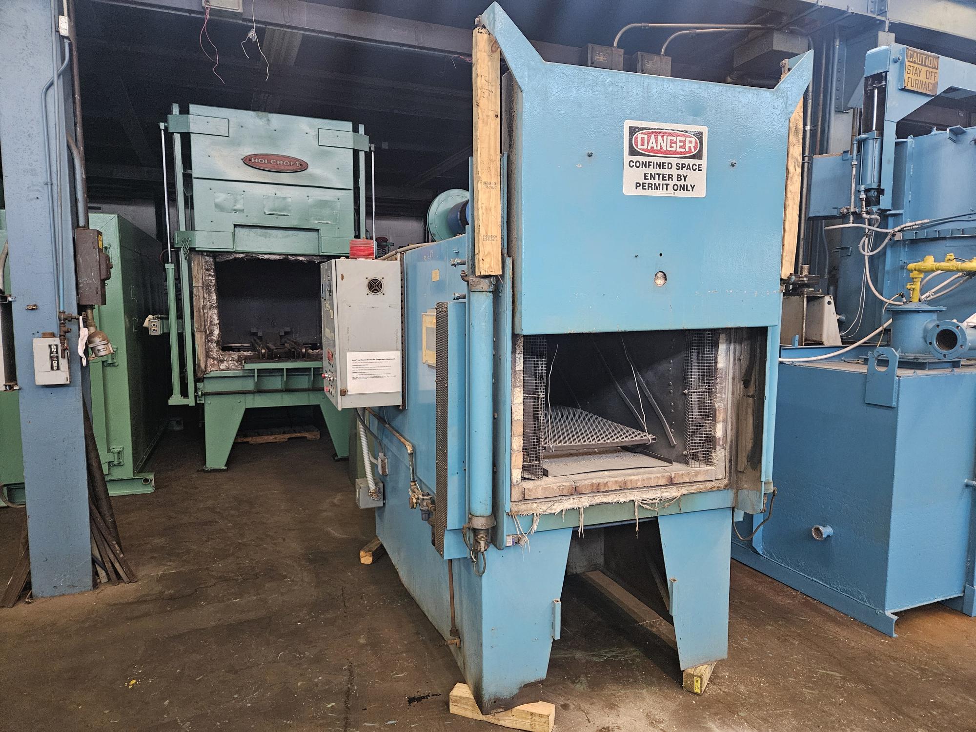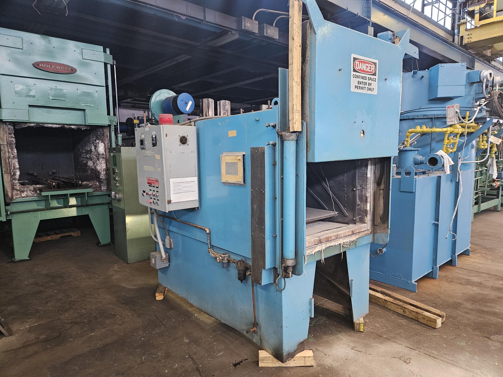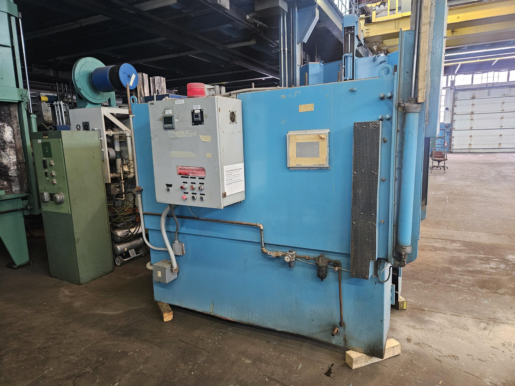 Brick Lined Recirculating Box Tempering Furnace complete with Rear-Mounted Alloy Recirculating Fan (10 H.P.), Alloy Liner, and Pneumatic Vertical Rising Front Door.