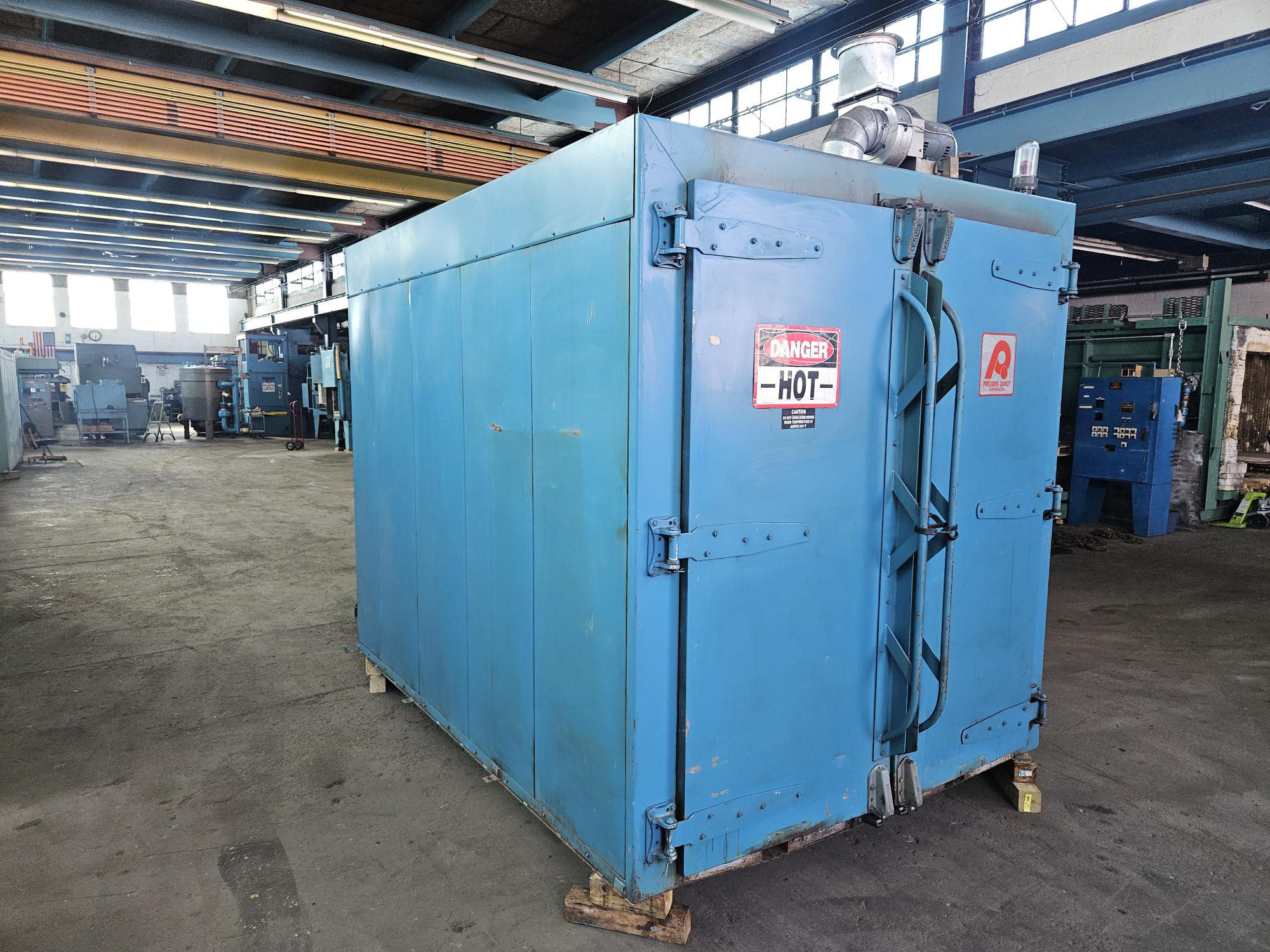 Recirculating Class “A” Solvent Rated Walk-In Oven complete with Horizontal/Vertical Air Flow, Rear-Mounted 7.5 H.P. Recirculating Fan, Eclipse Burner System, Insulated Floor with Cart Tracks (“V” – Groove), Powered Exhauster, and Roll-In Cart. “V” Groove Tracks for Outside of Oven included.