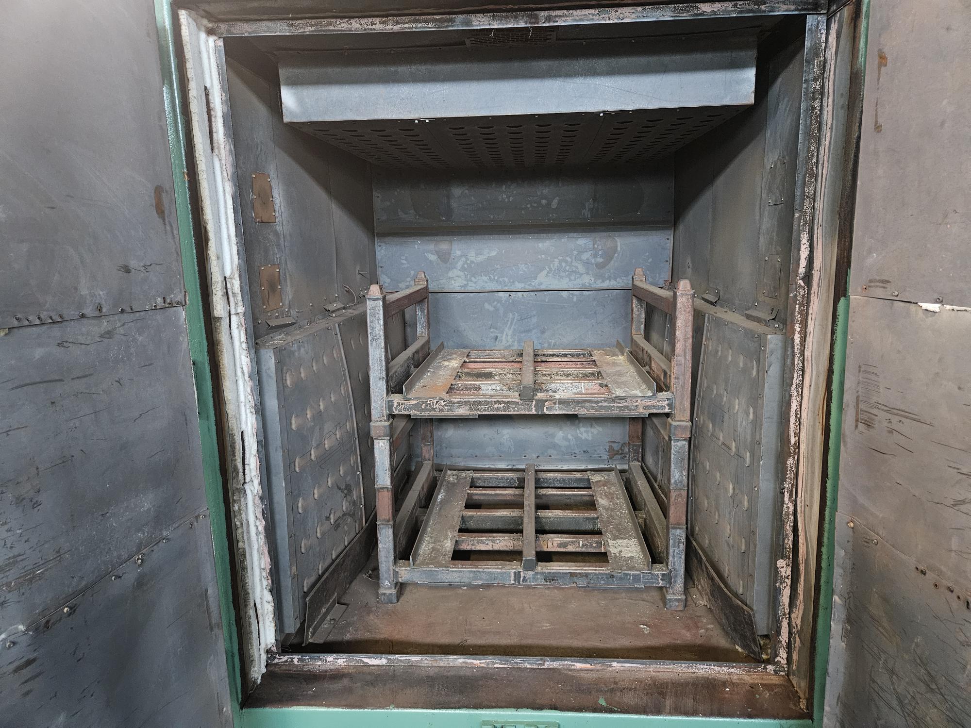 Recirculating, Solvent Rated Walk-In Oven complete with 7.5 H.P. Rear-Mounted Recirculating Fan, Combination Horizontal/Vertical Air Flow, Double Swing-Out Front Doors, Eclipse Burner System, and Powered Exhaust.